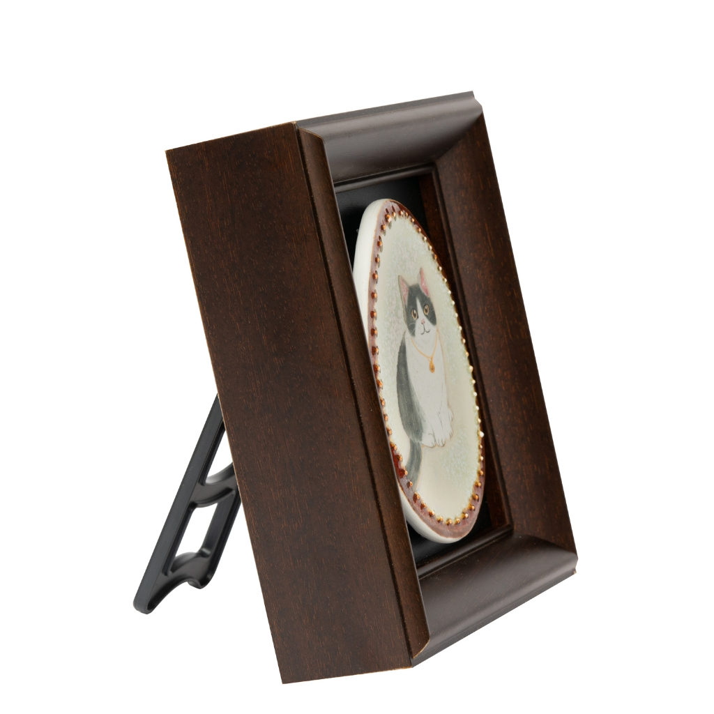 Framed in warm wood, this handcrafted tile captures your pet’s spirit —