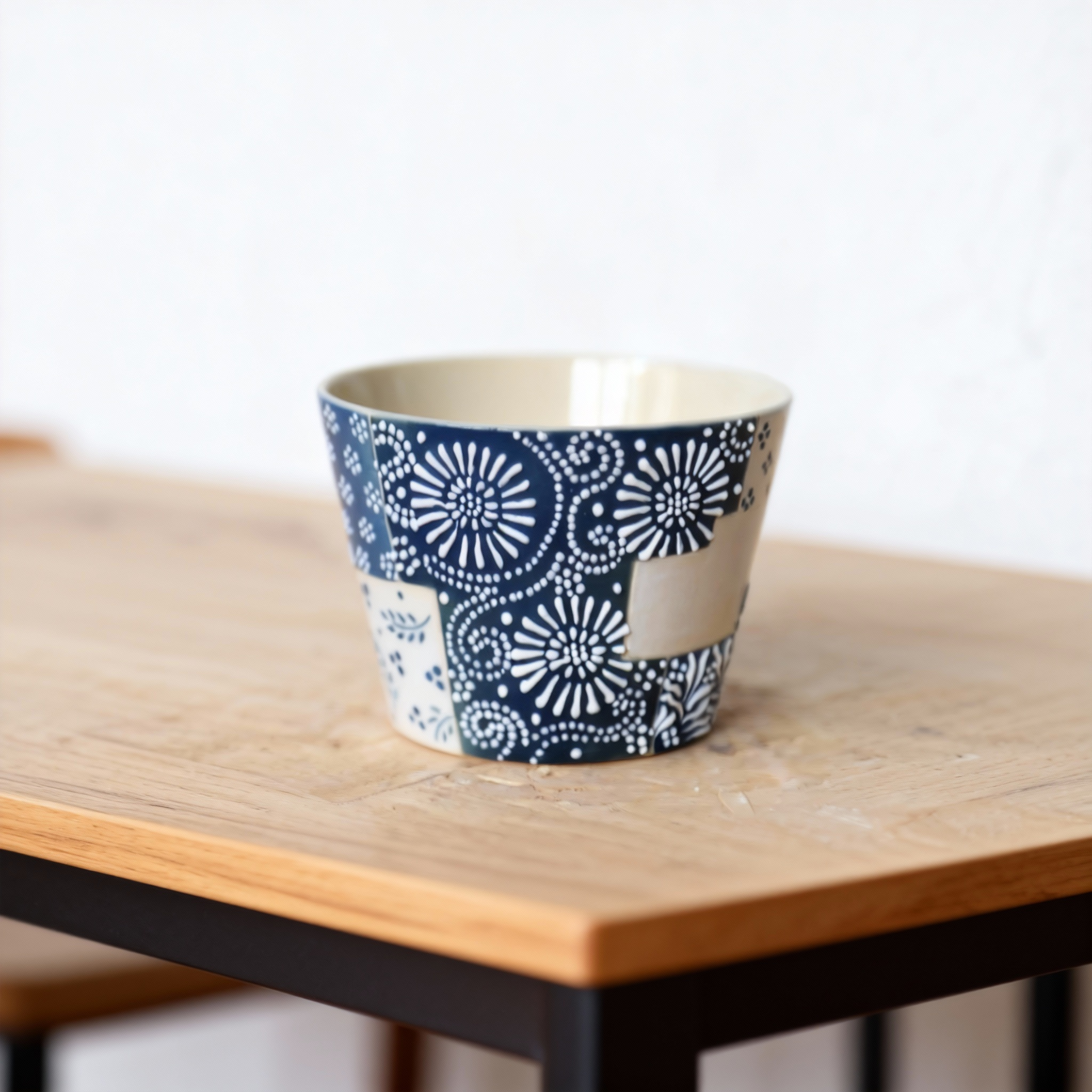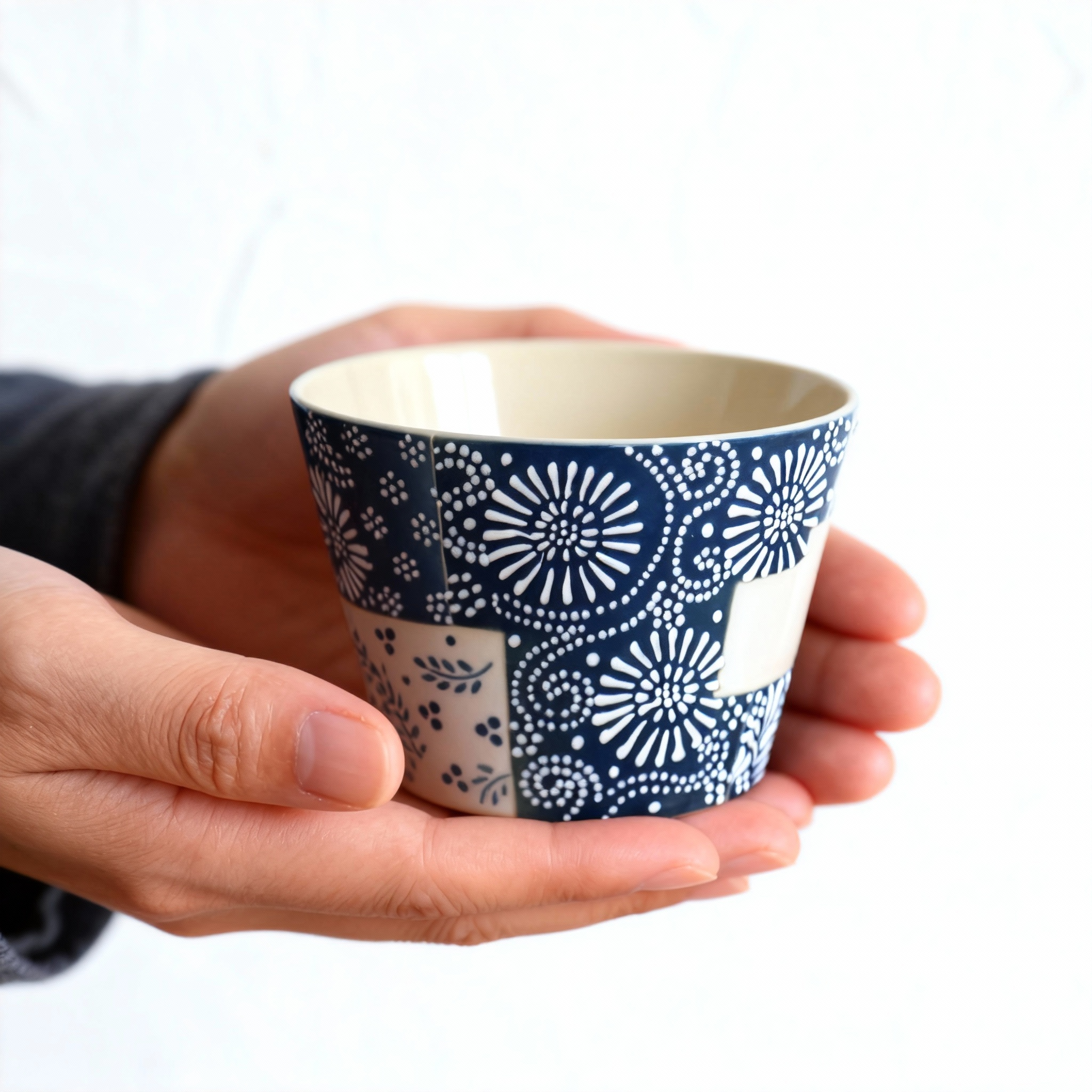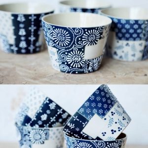 Each cup features hand-painted quilt patterns inspired by Sashiko stitching.